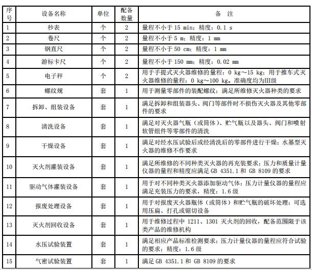 三級消防設施維護保養齊齊哈爾檢測設備用于滅火器的檢查、維修、更換滅火劑及回收,其設備配備的種類和數量至少應滿足表 3 的要求。