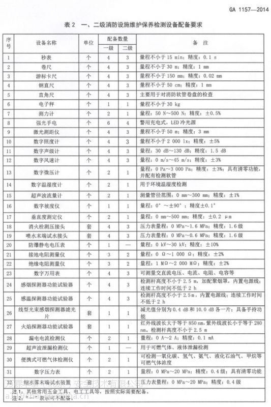 一二級消防設施維護保養齊齊哈爾檢測設備用于建筑消防設施的維護、保養和檢測,其設備配備的種類和數量至少應滿足表 2 的要求